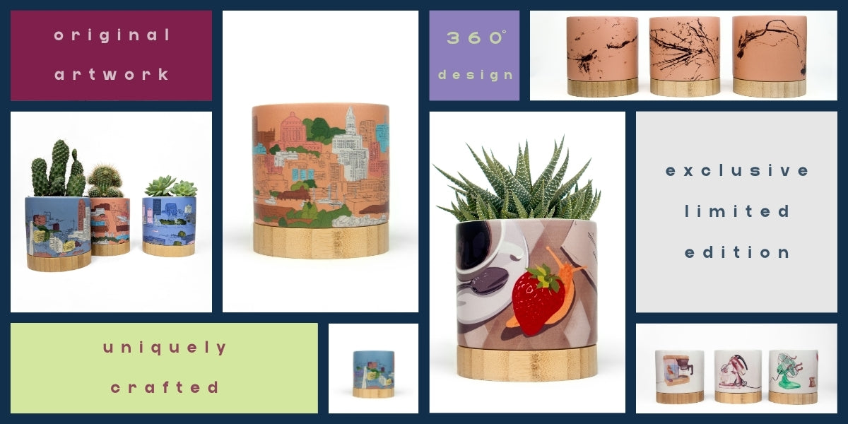 Hand-drawn skylines on ceramic planter pots celebrate the grit, heart, and vibe...